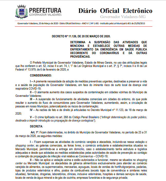 Vão continuar funcionando em Valadares supermercados, açougues, padarias, lojas de produtos veterinários, postos de gasolina (exceto lojas de conveniência), farmácias, laboratórios, clínicas, hospitais e outros serviços de saúde, distribuidoras de água mineral e gás de cozinha, empresas funerárias e de segurança privada.